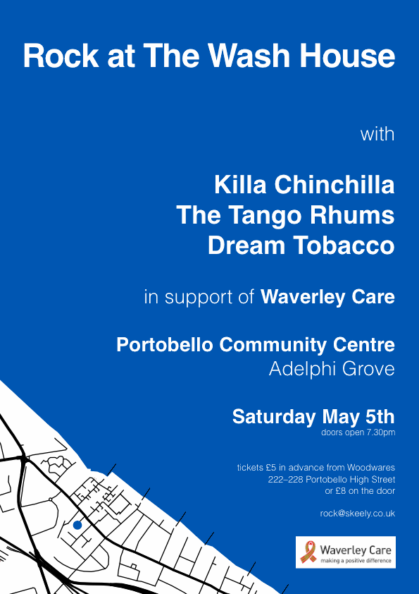 Hello Porty people, I just wanted to let you all know about 'Rock at The Wash House'. This is an exciting charity event that will be taking place in Portobello on Saturday the 5th of May and is going to be a great night of live music from 3 fantastic bands in aid of the charity Waverley Care held at the The Wash House (Portobello Community Centre). Tickets are only £5 each if you pre buy them and will be £8 on the door, they are available from Woodwares on the High st or you can contact me on